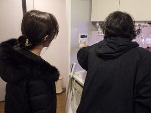 お客様と一緒に水漏れ・ガス漏れ確認中です。