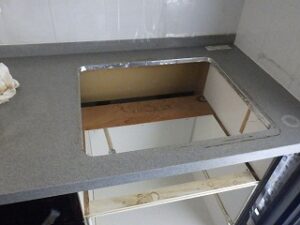既存のガスコンロをキッチンの天板より取り外します