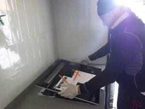 既存のガスコンロより、ガス配管を取り外して部材や天板なども取り外していきます