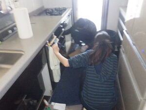 お客様と一緒にガス漏れを確認中です。