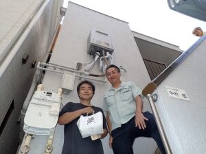 給湯器交換工事ご依頼ありがとうございます。お問い合わせのメールの時点で給湯器がちょっと高い位置にあり、この給湯器の交換ができますかとのことでお写真をいただき、これなら脚立と足ばいたを使えばできるかなと思い、急遽交換工事になりました。作業中も水漏れやガス漏れ確認を一緒にご確認いただきありがとうございます。また何かの際はよろしくお願いいたします。