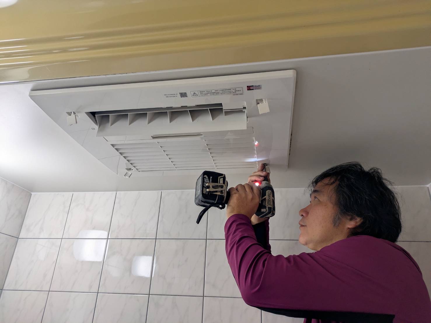 うちのお風呂の天井部分はちょっと変な勾配が付いているところがあり、そちらのせいで1回ノーリツさんの浴室乾燥暖房機を持ってきてくれたのですが、収まらないことがわかり、後日にリンナイさんの浴室乾燥暖房機を持ってきて無事に工事をしてくれました。